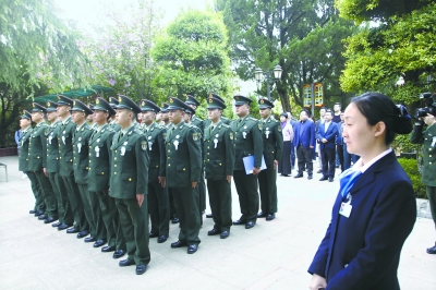 部队官兵前来祭奠英烈,刘琪在旁负责引导接待 记者徐锦博 摄