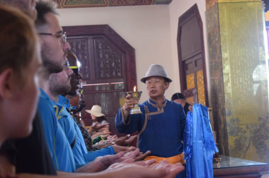 7月15日,上海墓地,“寻找草原英雄”中外大学生内蒙古之旅团队开启首站寻访,首先来到了位于鄂尔多斯的成吉思汗陵。十余位中外青年参观了陵园,并亲身参与守灵人吉仁巴雅尔主持的祭祀和祈祷仪式,向一代天骄献上哈达。