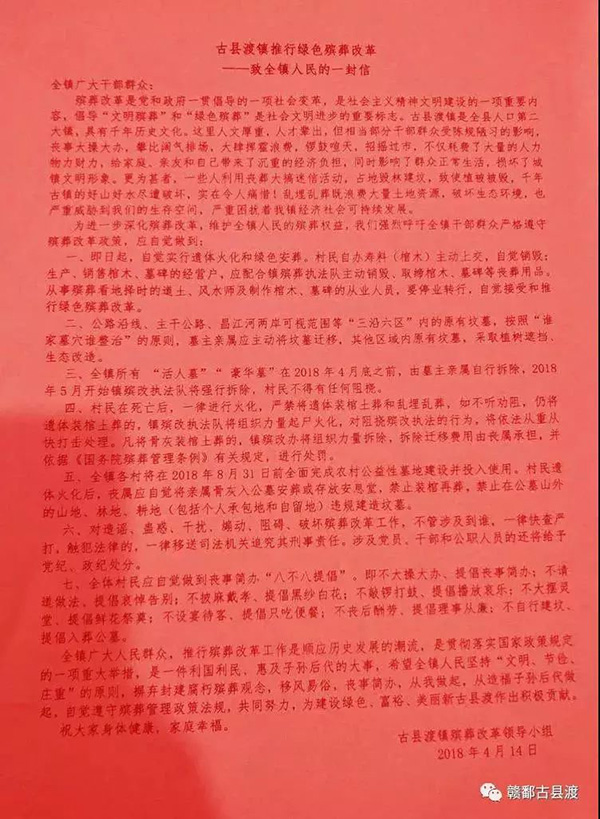 江西古县渡镇在今年4月12日也召开了“打好殡改攻坚战”会议,会议决定在全镇推进绿色殡葬建设,全面加强公益性墓地建设、整治乱埋乱葬、提高火化率等等。