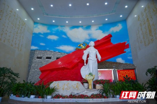 走進紀念館前廳,迎面而來的是楊開慧烈士的白玉雕像,隻見火紅的黨旗背景前,一位女英雄,腳步堅定,雙拳緊握,眼睛看向前方,在她的眼中,仿佛有兩束燃燒的烈火,控訴著舊社會的黑暗,很多人一進門看到這雕塑就被震撼到了。